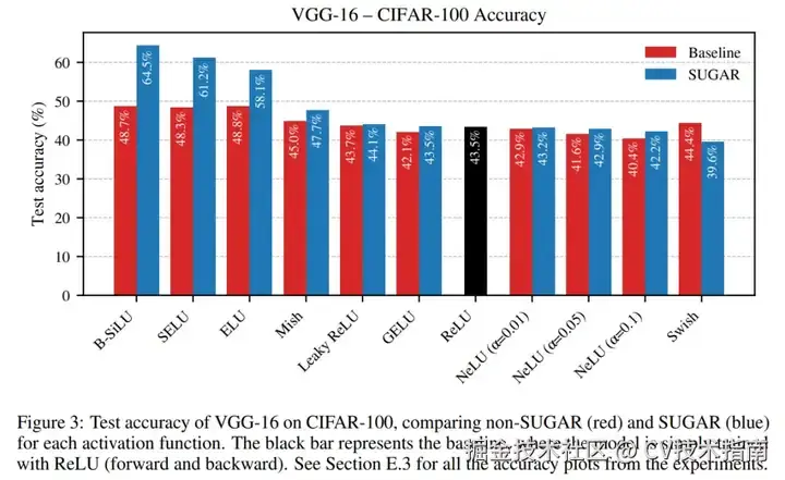 在 CIFAR-100 数据集上,SUGAR 结合 B-SiLU 的优势更加明显:ResNet-18 的准确率从 48.99% 跃升至 56.51%,VGG-16 的准确率从 48.73% 提升至 64.47%(见图 3)。同样,Leaky ReLU 和 NeLU 仅显示出微小的甚至是负的提升(例如 ResNet-18 上的 43.67% → 43.41%)。