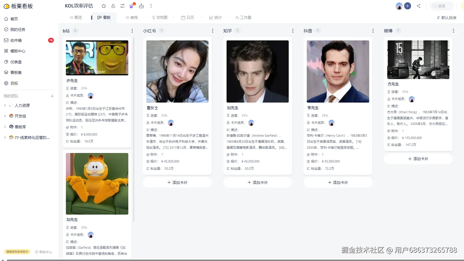 - 核心功能:借助可视化看板管理KOL合作全流程,支持需求对接、内容共创、排期执行、复盘归档等全链路数字化。任务卡片支持子任务拆解,如脚本修改可拆分为卖点提炼并@文案,视觉设计并@设计师。