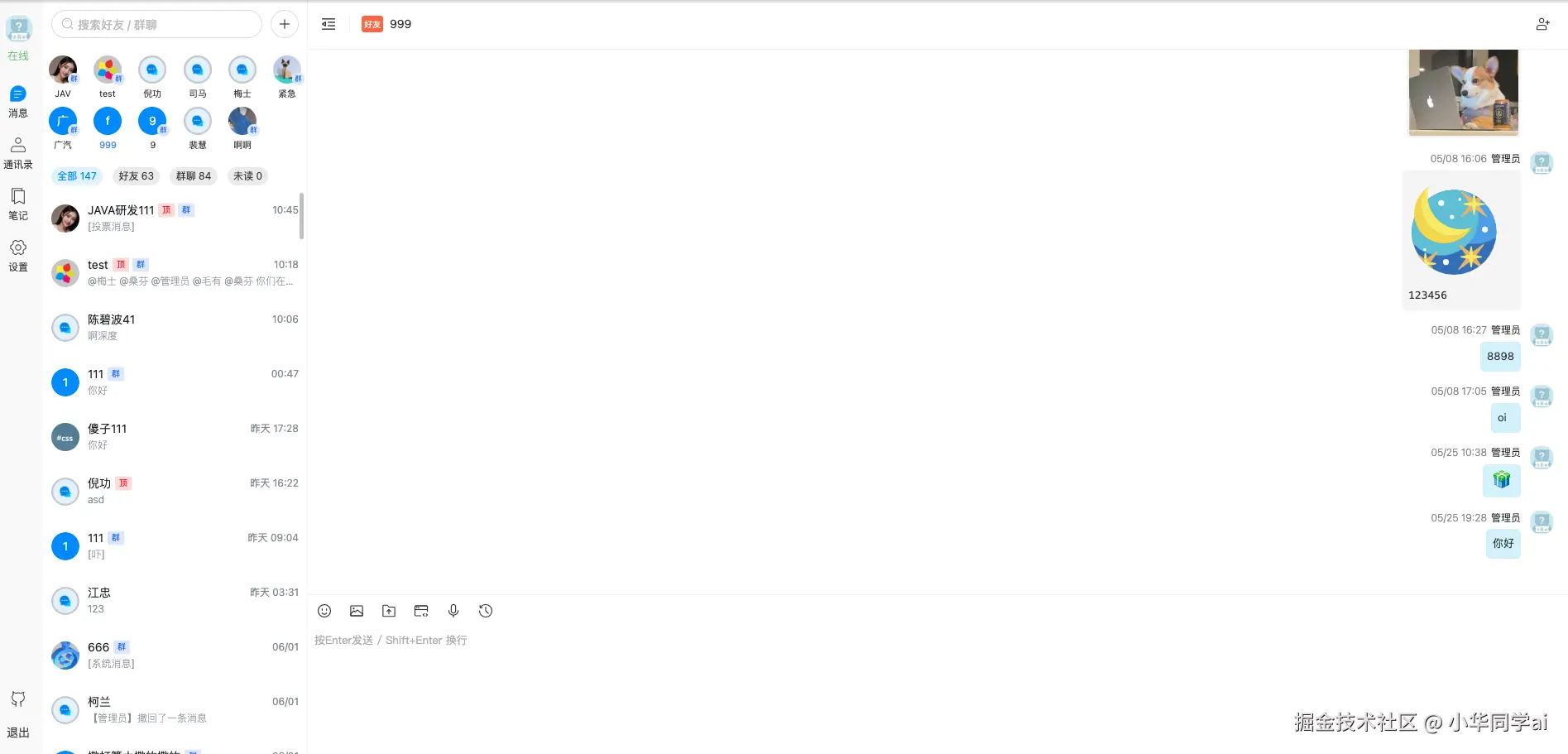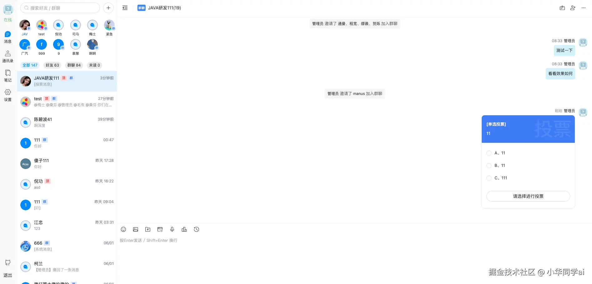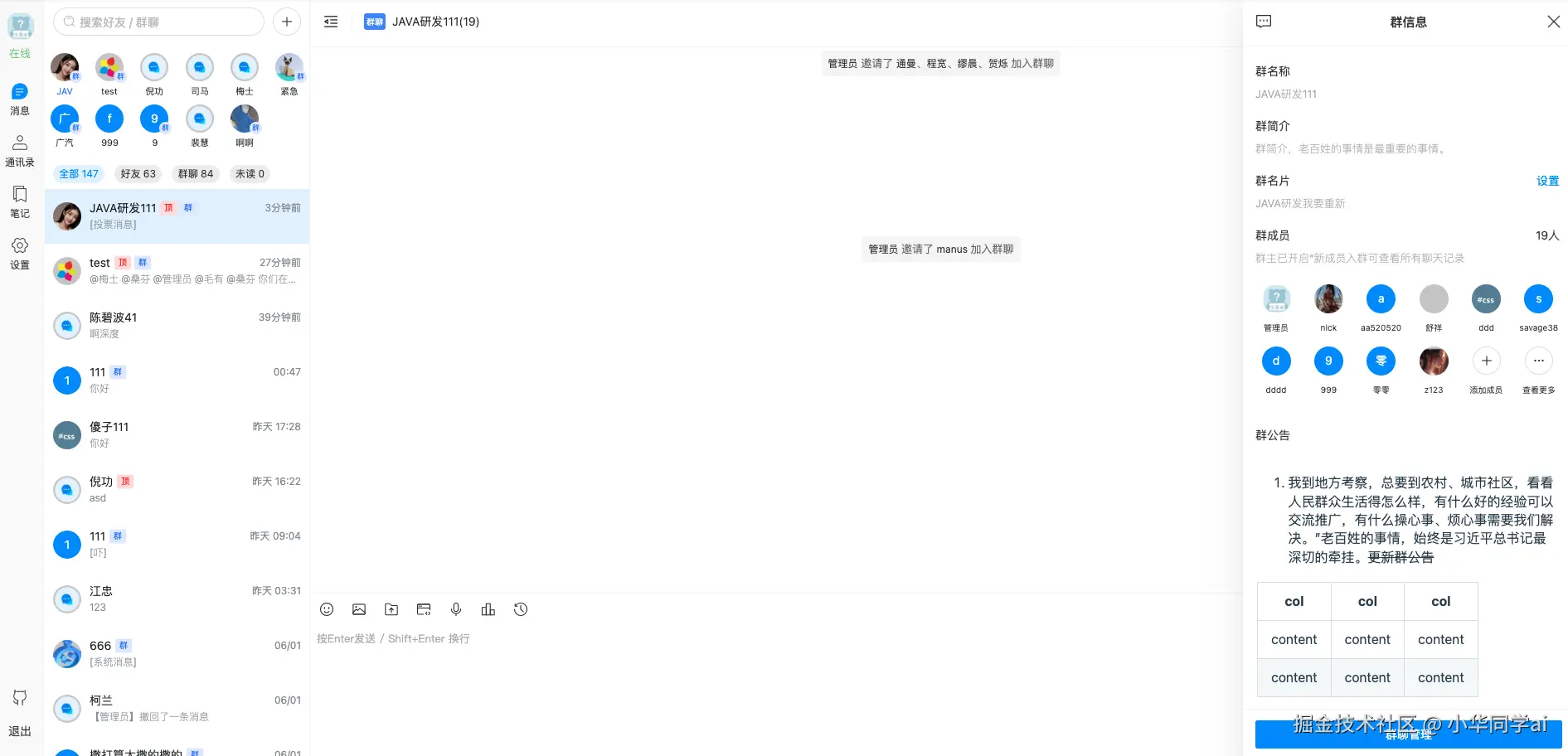 - 私聊与群聊:支持一对一私聊和多人的群聊功能。