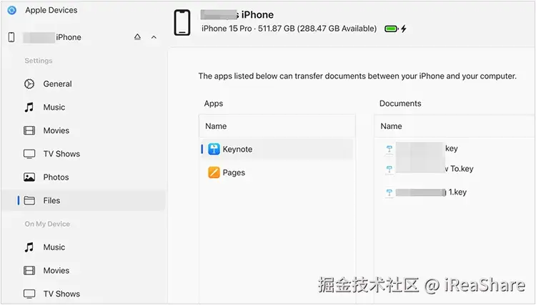 步骤 2: 打开“Apple 设备”应用。你的 iPhone 应该会出现在侧边栏中。然后点击左侧面板上的“文件”。你将看到 iPhone 上安装的应用列表。