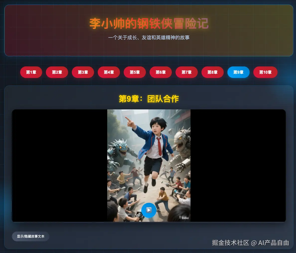 然后利用AI工具,根据这些个性化设定,自动生成了一套10章节的冒险故事。