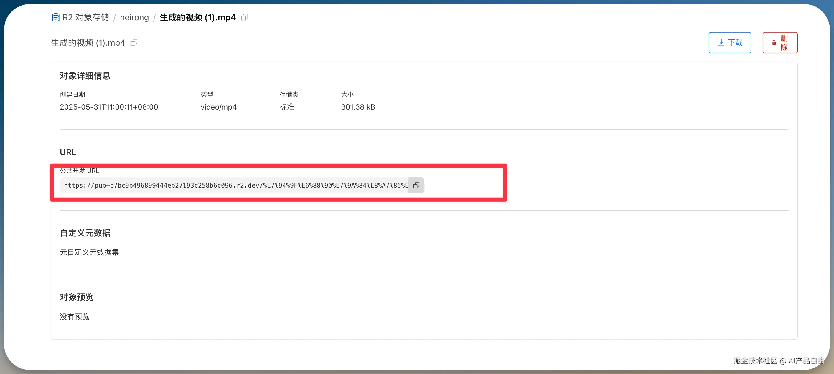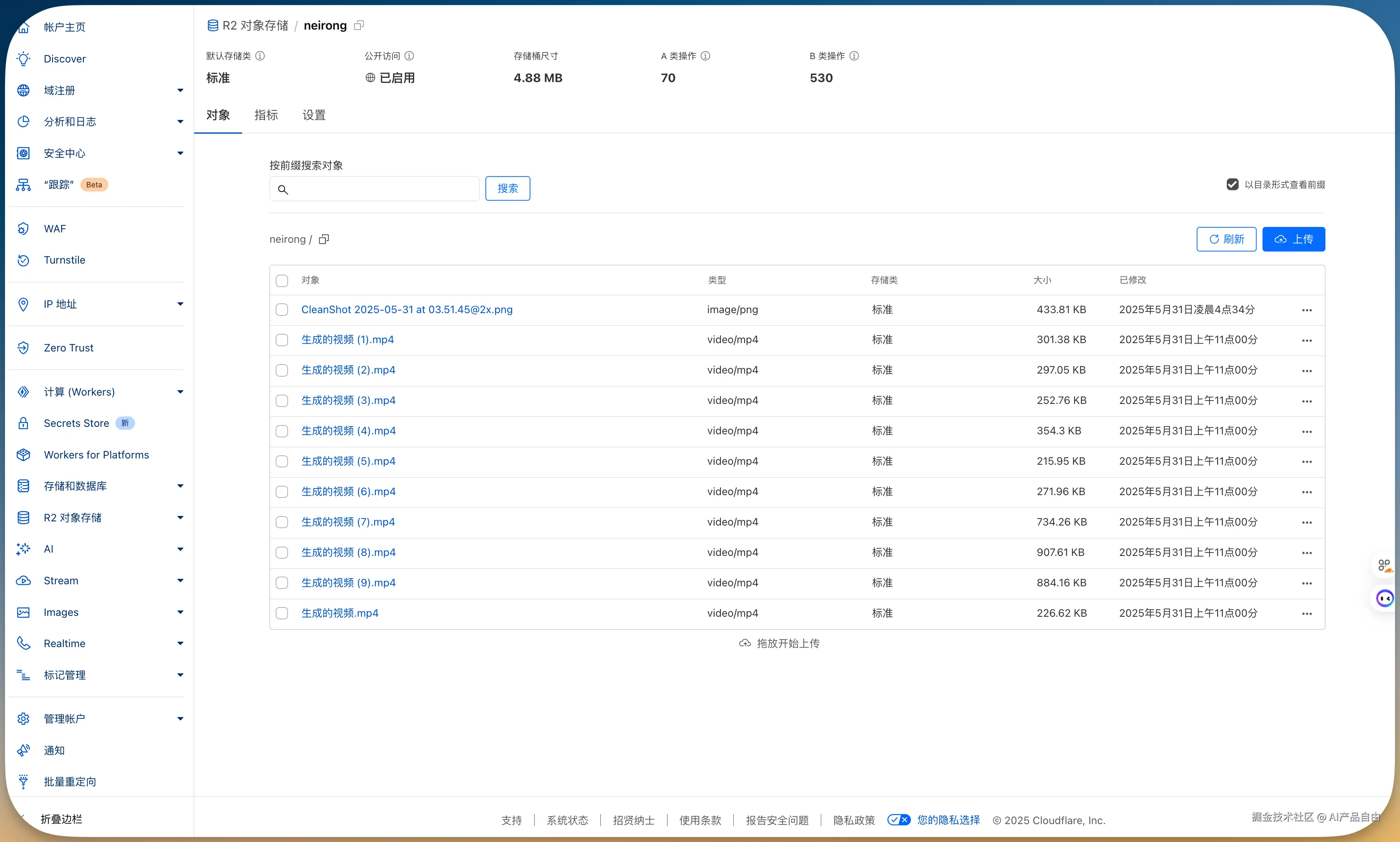生成的视频需要有个地方存放,Cloudflare R2有免费额度,对我们这种小项目来说完全够用。