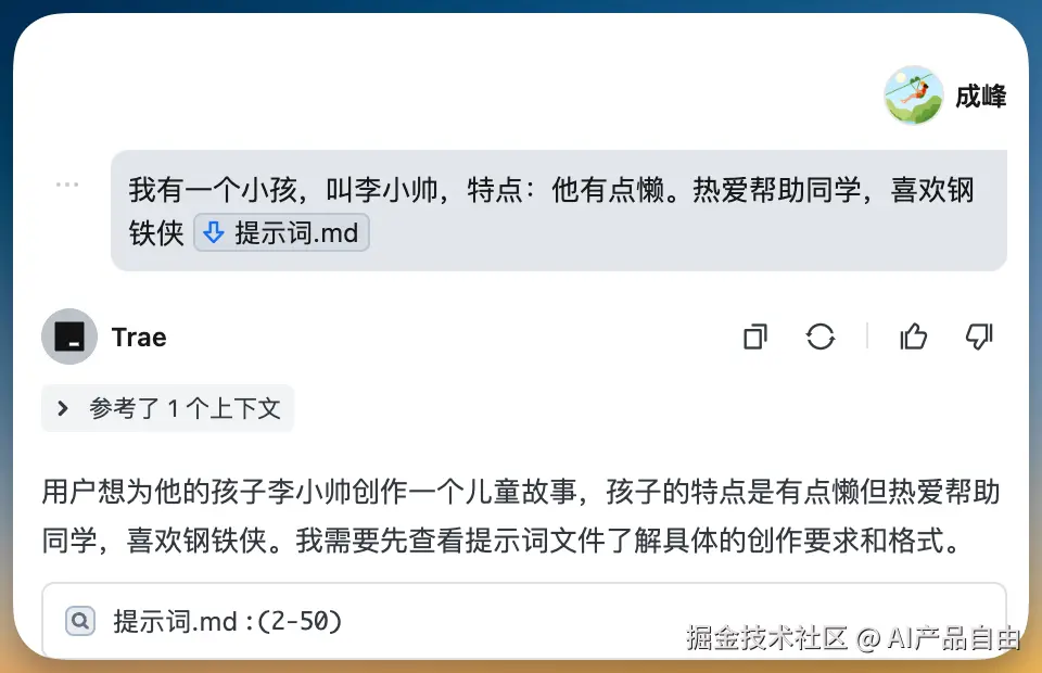 比如输入"李小帅,6岁,有点懒···",trae就会生成一个帮助他克服胆小的冒险故事。