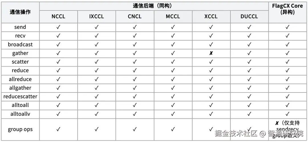 上表列出的同构通信后端是基于FlagCX统一适配器模块来实现对厂商原生通信库的兼容,包括NCCL、IXCCL、CNCL、MCCL、XCCL和DUCCL等,主要负责执行同构芯片间的通信操作。FlagCX Core负责实现跨芯异构Send/Recv操作,并利用异构Send/Recv和同构通信后端来实现跨芯异构集合通信操作。