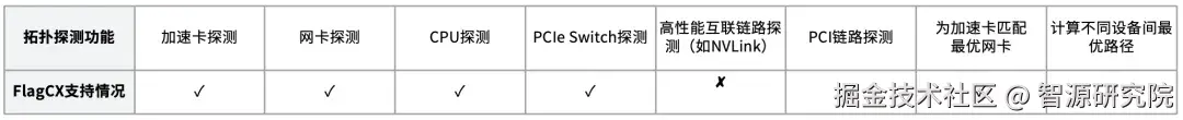 FlagCX 新增服务器级的自动拓扑探测模块,支持自动识别服务器内部硬件拓扑和通过读取xml格式的统一拓扑文件来获取拓扑信息。拓扑模块通过调用厂商适配过的统一接口和读取服务器的系统信息,能实现对不同厂商服务器内部硬件拓扑的自动化探测。目前,拓扑模块可探测服务器内部的加速卡、网卡、CPU、PCIe Switch及设备间的PCI链路等信息,并自动生成层级化的拓扑结构。更进一步,拓扑模块还能通过计算加速卡与网卡距离,为每个进程智能匹配最优网卡,显著提升跨节点通信效率与带宽利用率。下表展示了具体的拓扑探测相关功能: