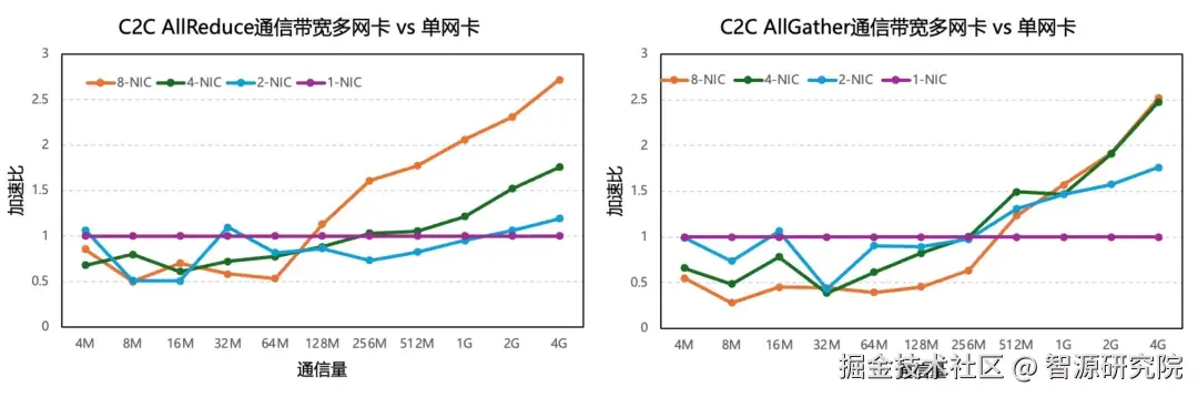- 对于C2C AllGather,八个网卡(8-NIC)配置的实测跨芯通信带宽在384M以上通信量时超越单网卡(1-NIC)配置,而当通信量达到4GB时提升2.5倍。