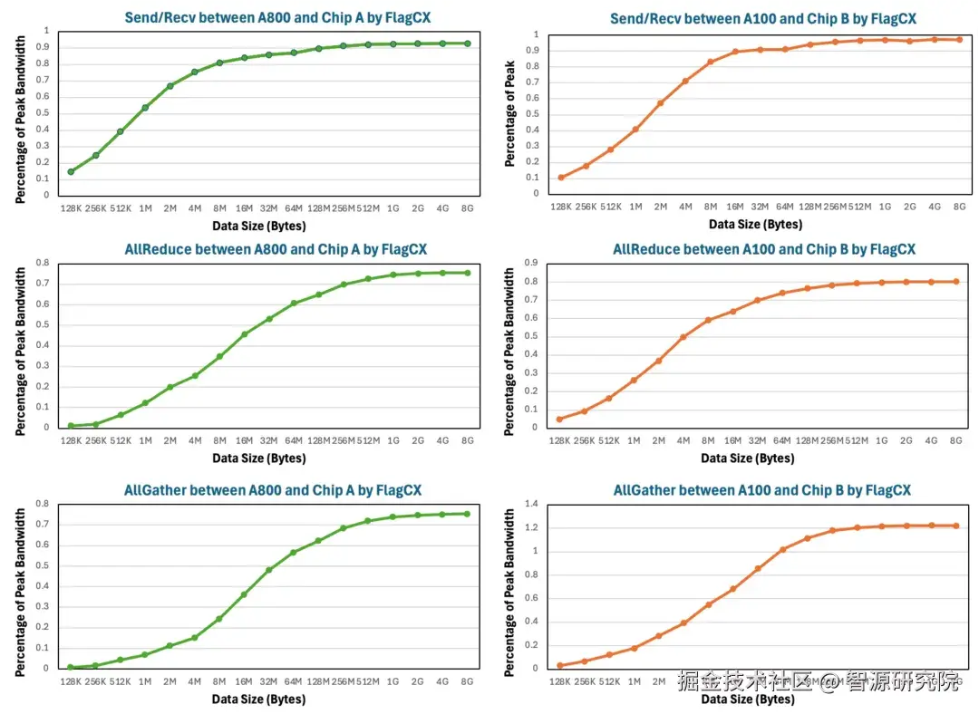 AllGather的通信带宽在A800+ChipA上能达到峰值带宽的75%,而在A100+ChipB上能达到峰值带宽的120%