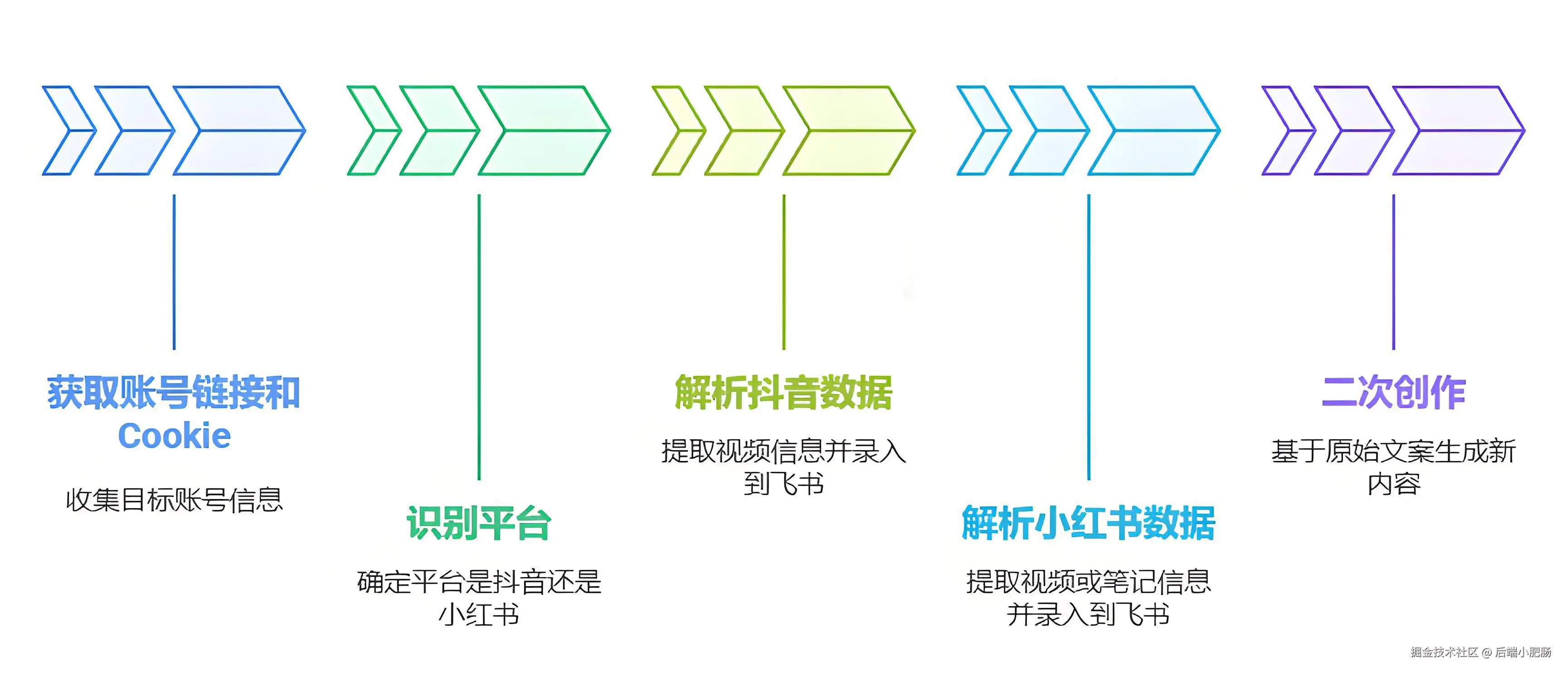 对平台进行判断,如平台为抖音则开始解析抖音链接,将视频信息如点赞数、分享数、视频链接、视频文案等录入到飞书表格;如识别平台为小红书,需要进行判断是否为视频,如为视频则将视频信息如点赞、分享、视频链接、视频文案等录入到飞书,如果为普通笔记,则将笔记信息如点赞、分享、图片、原文等录入到飞书;