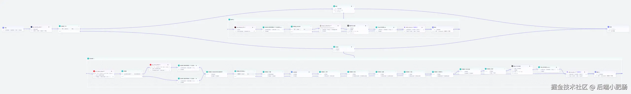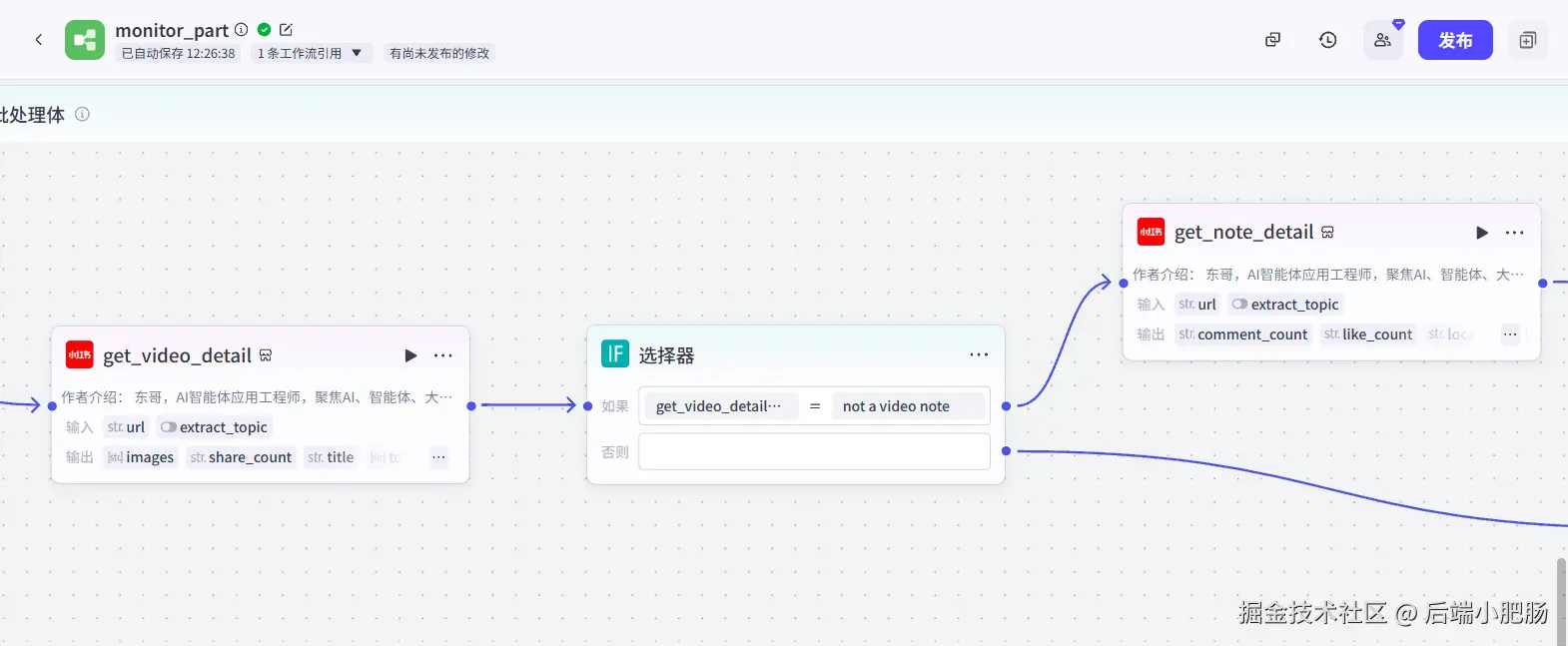 之后就是获取符合规格的笔记,然后获取笔记内容进行二创,最后写入飞书表格,和抖音那条技术路线一样,我不再赘述,上述就是整个 工作流 的主要流程,整个工作流涉及到几十个节点,流程相对复杂,动手能力强的读者可以根据以上思路研究一下。如果想直接获取工作流,可以加入社群后我拉你进Coze空间直接学习使用。