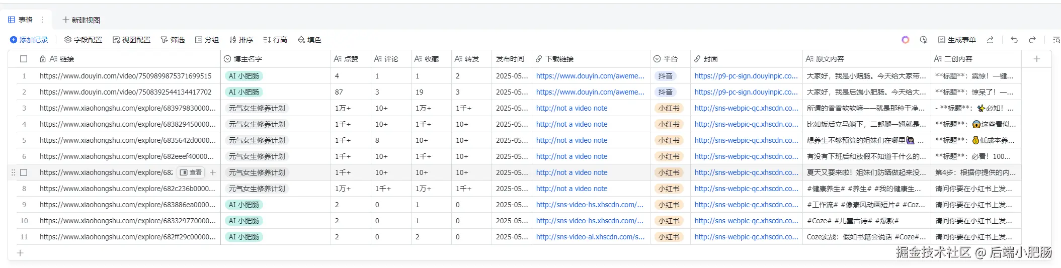 拿到符合规格的作品信息,我们之后的操作就是提取抖音视频文案,基于文案进行二创,将内容一起写入飞书表格: