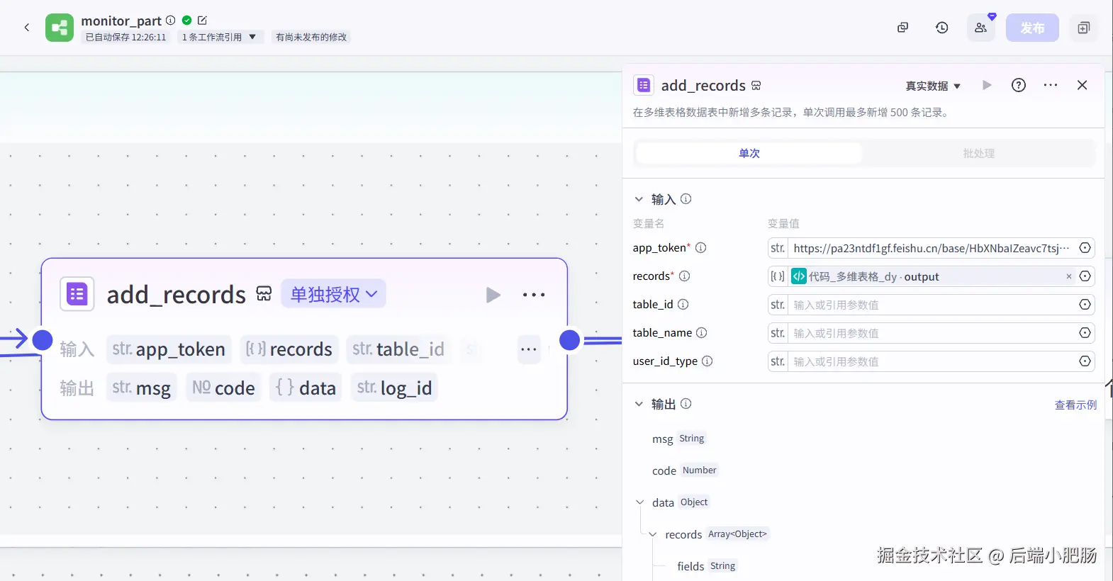 接下来我们只需要使用add_records这个插件将内容写入到飞书表格即可: