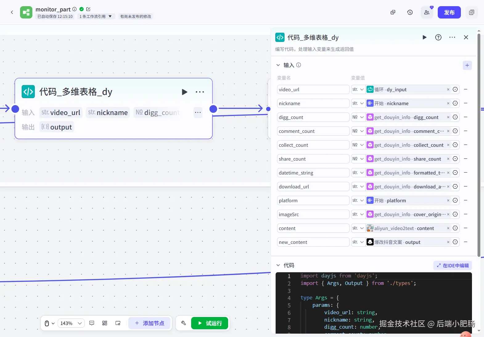要写入飞书表格的信息都已经准备好,接下来我们只要将这些信息转换为飞书表格的适配内容就行,我这里用到了代码节点: