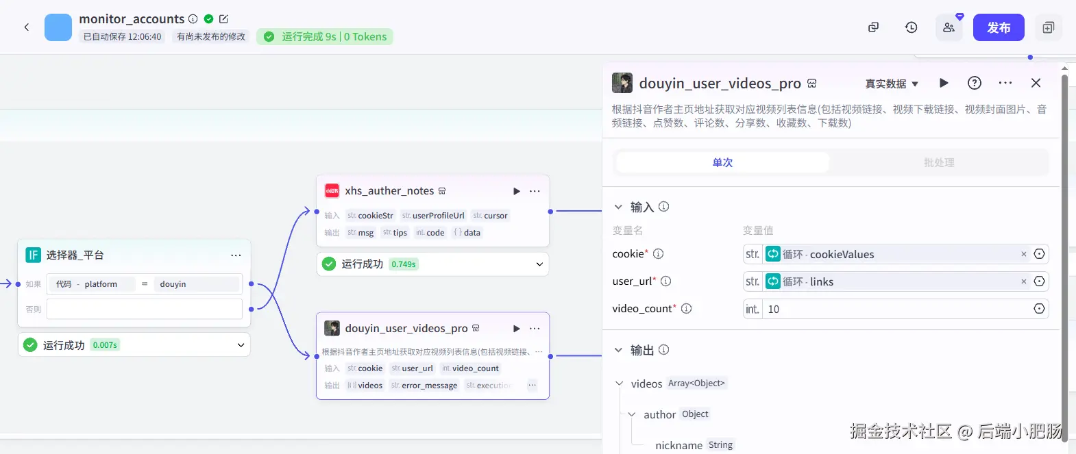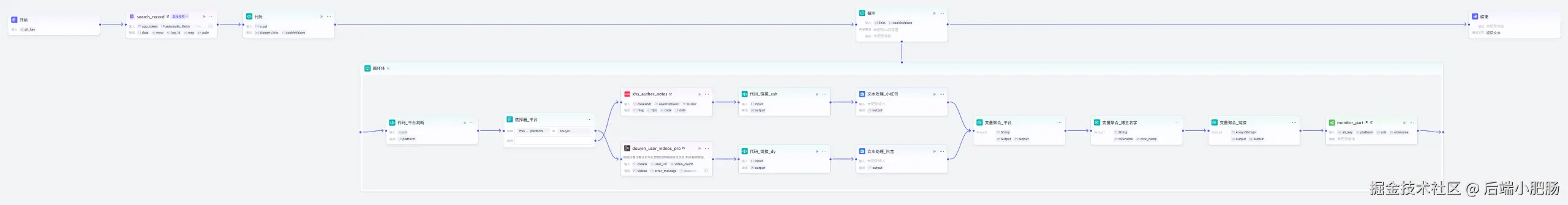 通过本文的详细讲解,相信你对如何使用 Coze 工作流 批量采集 抖音 和 小红书 对标账号信息,并将其整理到 飞书表格 中有了更清晰的认识。虽然整个工作流涉及的节点较多,流程也相对复杂,但只要理清思路,掌握关键节点的配置方法,你也能搭建出属于自己的高效情报收集系统。