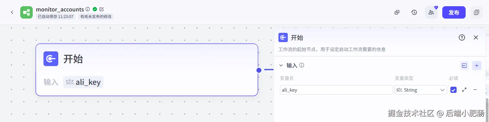 开始节点: 开始节点接收参数为阿里云百炼的key,作为后面提取视频文案的关键参数: