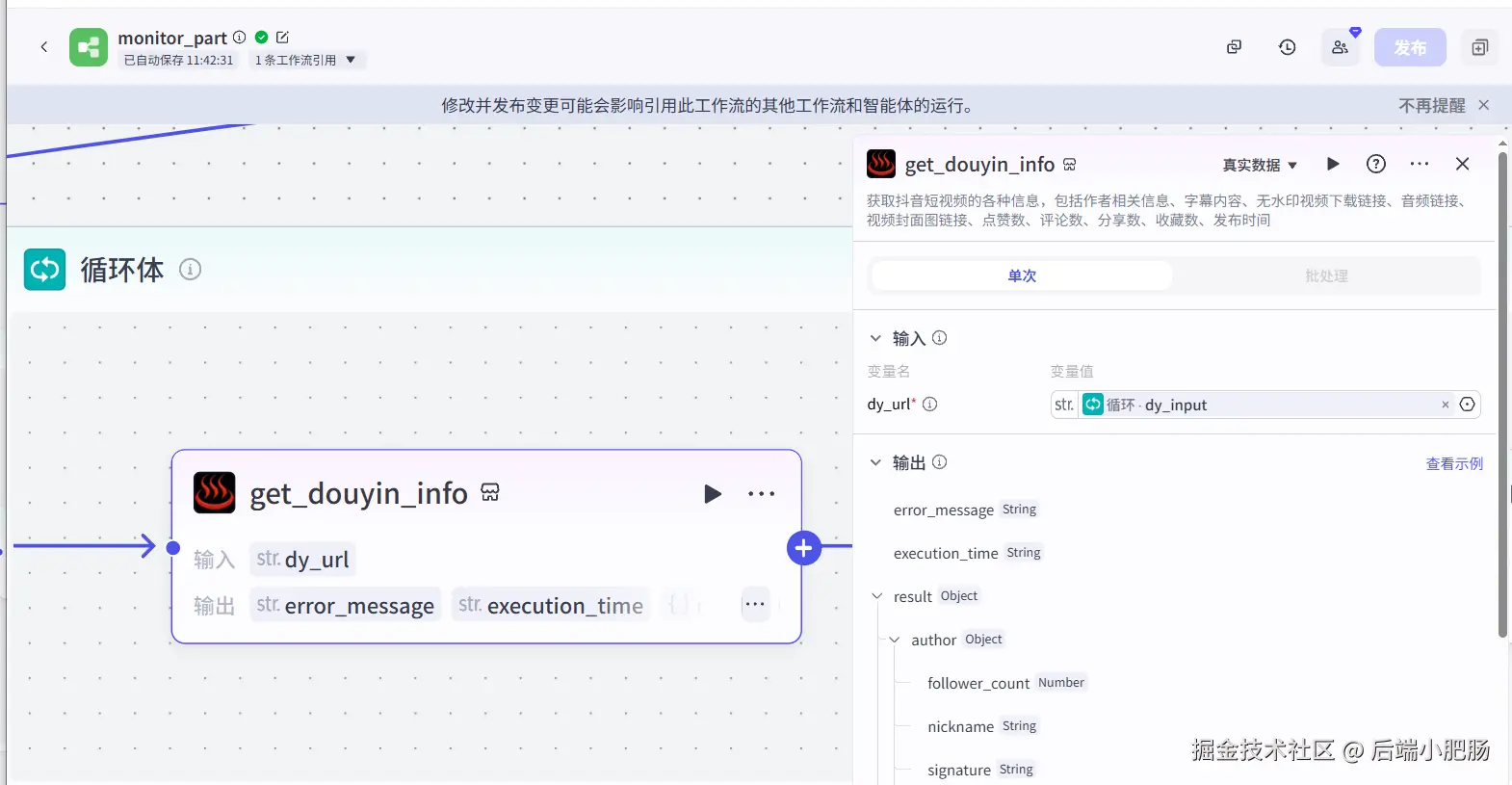get_douyin_info(插件): 这个节点可以根据链接获取抖音短视频的各种信息,包括作者相关信息、字幕内容、无水印视频下载链接、音频链接、视频封面图链接、点赞数、评论数、分享数、收藏数、发布时间。
