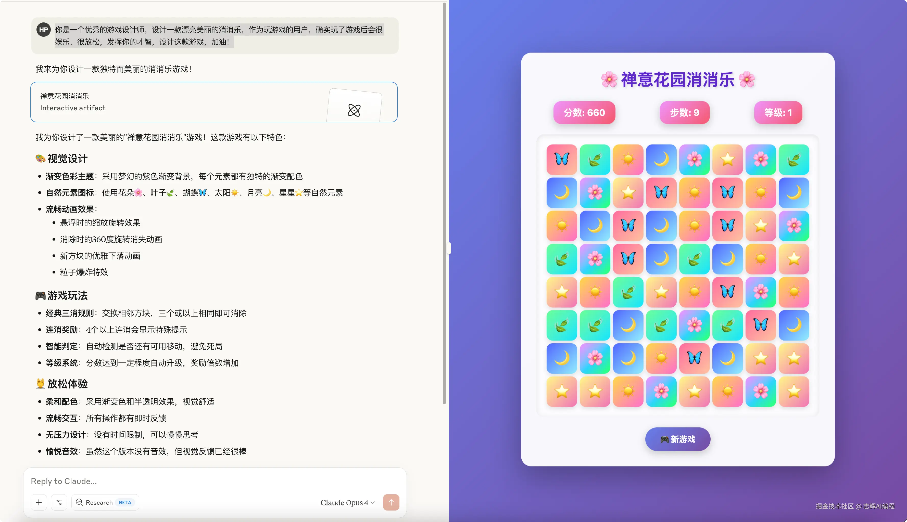 可以看到,如果提示词带上中间的逻辑关系,Claude 4 会更加的注重细节,会更让产出的东西更加完美。
