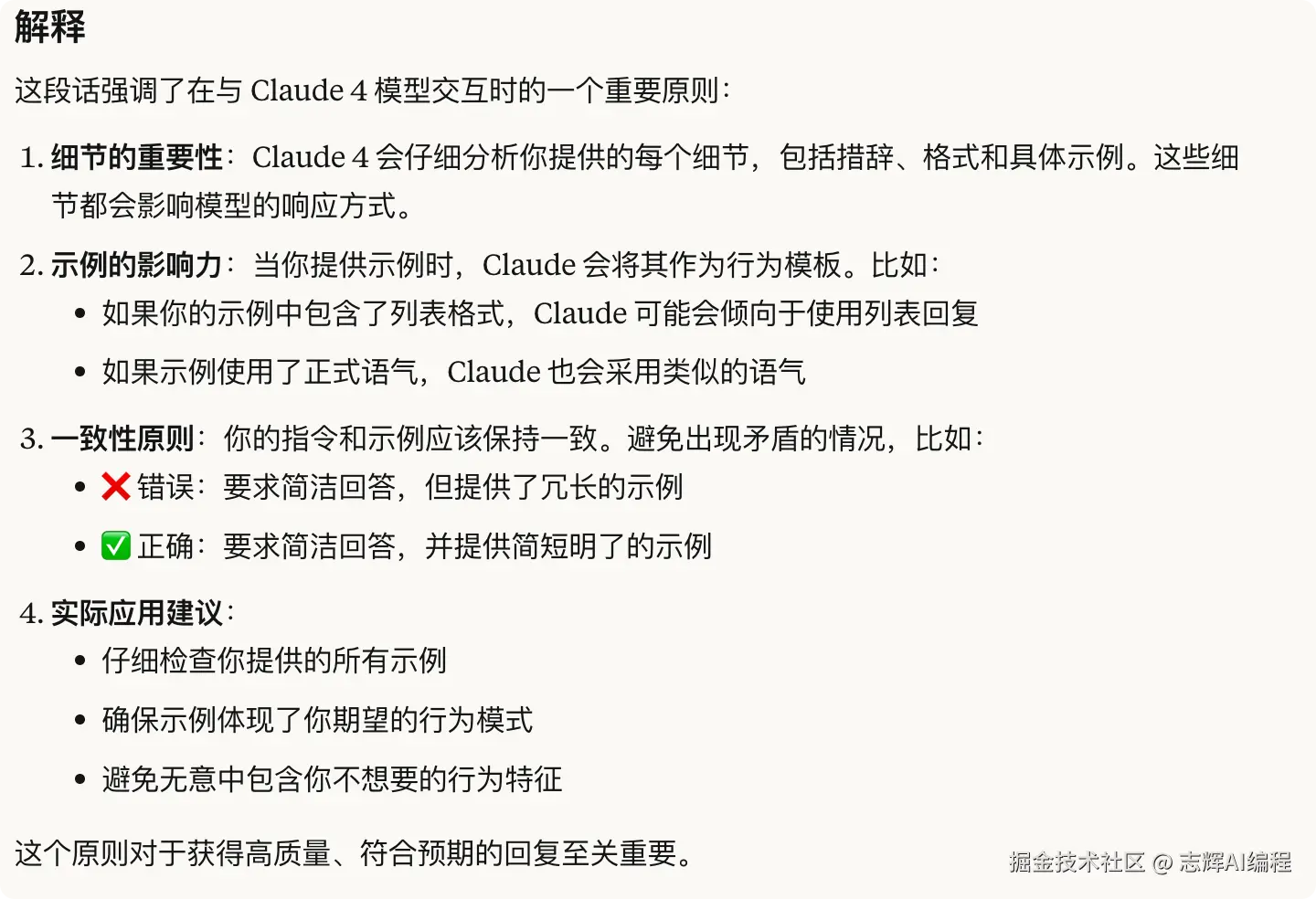 Claude 4 模型在遵循指令时会特别关注细节和示例。确保你的示例与你想要鼓励的行为保持一致,并尽量减少你想要避免的行为。