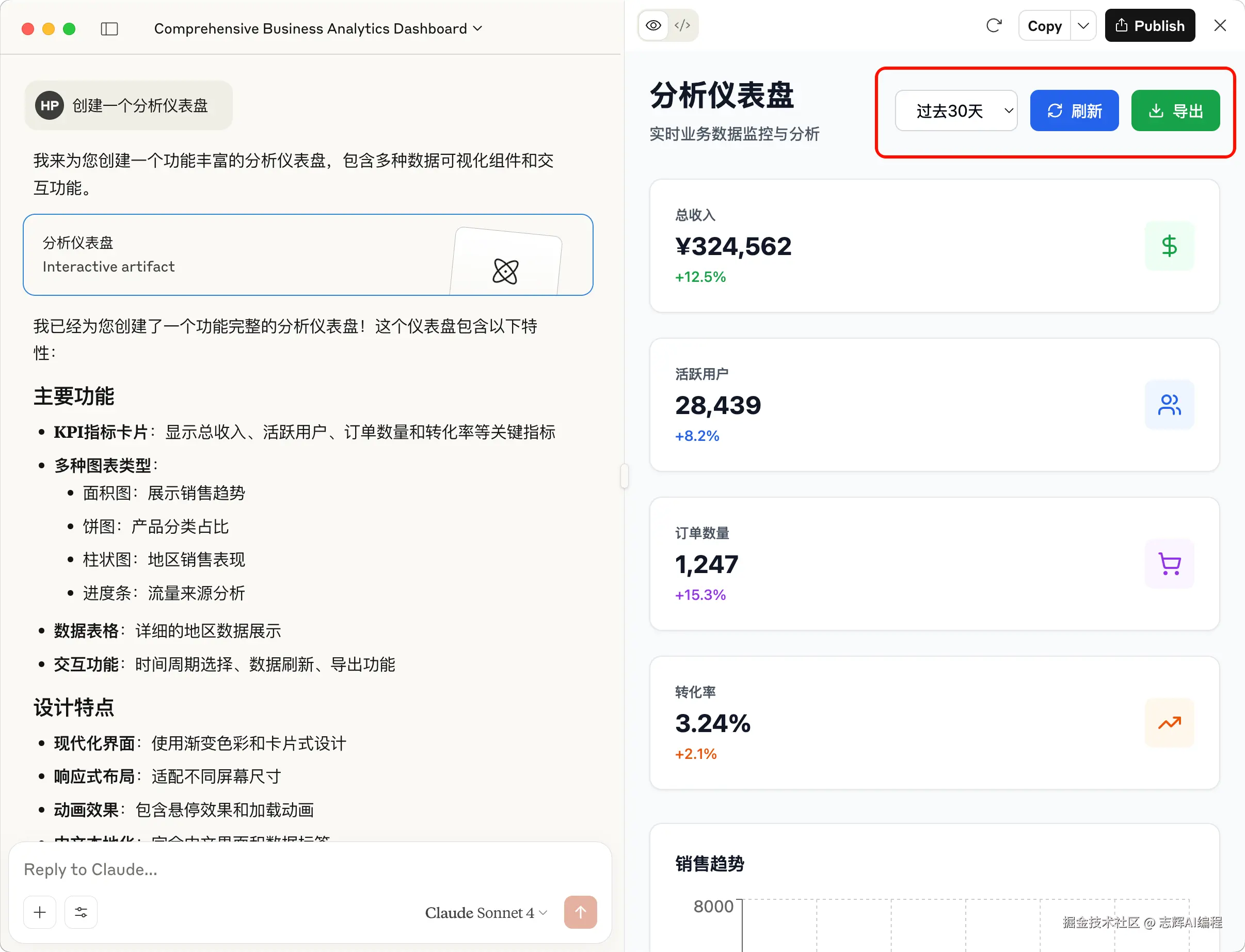 创建一个分析仪表盘。尽可能多地包含相关功能和交互。超越基础功能,打造一个功能完备的实现方案。