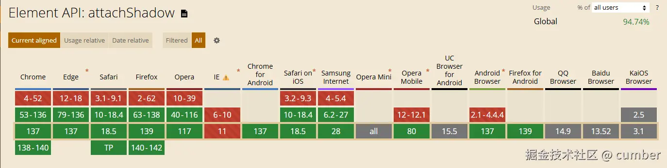 attachShadow 在主流浏览器中都已经得到了支持,IE 是一贯的不兼容。主要是移动端兼容情况还不明了,特别是国内各家手机厂商生态太过丰富,百花齐放。