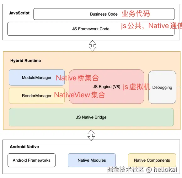 | React Native Framework | RN框架核心 | • 组件树管理 • 平台抽象层 • 事件系统封装 • 样式处理 |