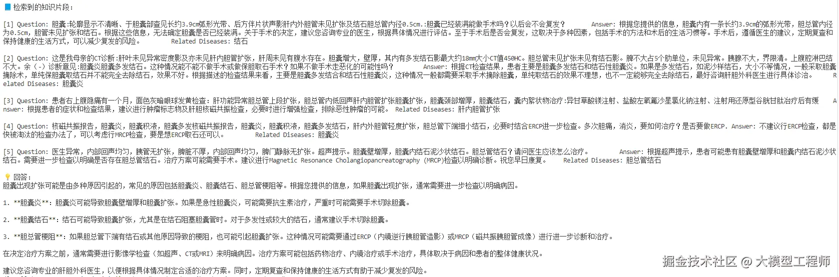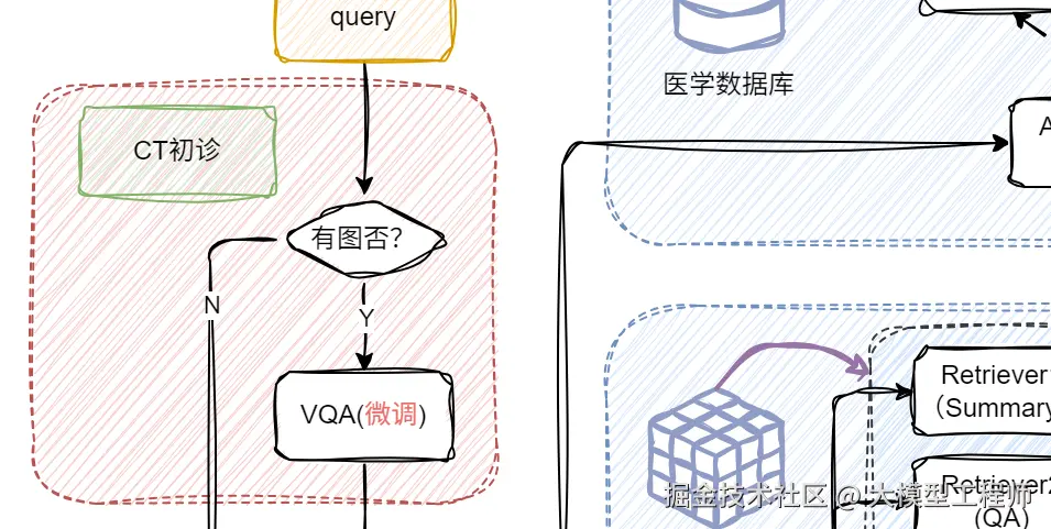📌 原理:输入(用户带 CT 提问 + 微调后的 VQA 的初诊结果) → 向量检索相关医学知识 → 与输入拼接 → 喂给模型生成回答。