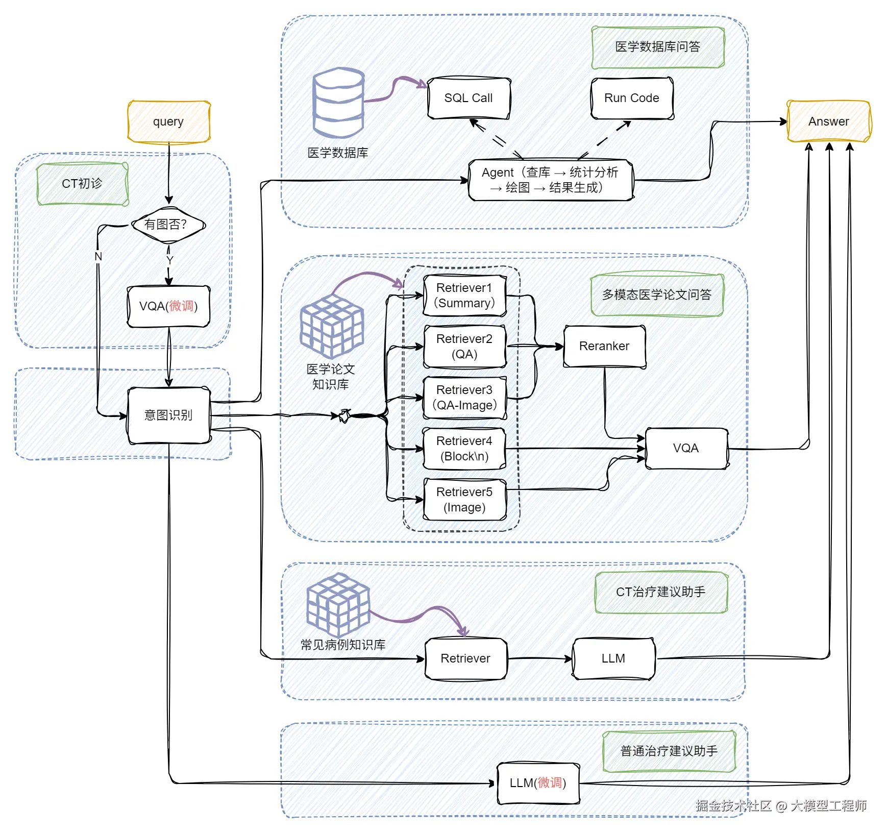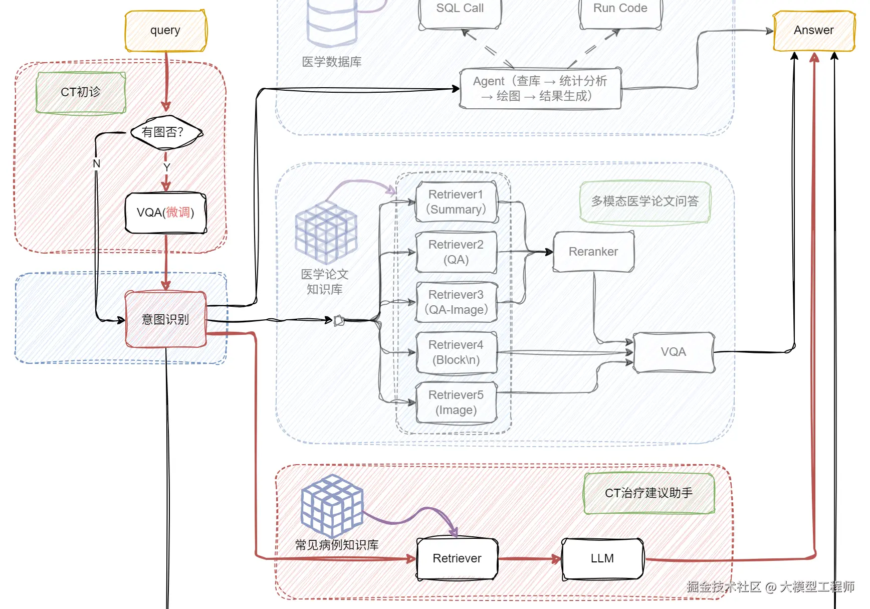 基于前面多模态与 BI 能力的深度融合实践,我们进一步将 RAG 系统向医疗垂直场景做了进阶升级 —— 如今这套架构不仅能处理常规的文本问诊,更能通过 VQA 模块与医学知识库的联动,实现 CT 影像解析与智能诊断辅助的核心能力,打通了从临床咨询到辅助决策的全流程服务闭环。下面就带大家看看这套融合多模态理解、数据统计与专业知识的医疗 RAG 系统是如何落地的!