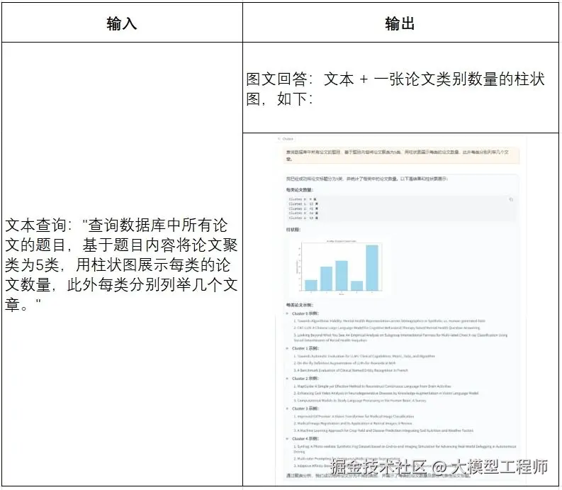 原有 RAG 仅支持文本生成,现在扩展为支持多模态输出,例如生成带有图片的回答或结合语音的解释。当输入为文本查询时,如 "查询数据库中所有论文的题目,基于题目内容将论文聚类为5类,用柱状图展示每类的论文数量,此外每类分别列举几个文章。" ,则会将相关检索结果(文本、图片)传给大模型,最后输出图文回答,如相关文本 + 一张论文类别数量的柱状图。
