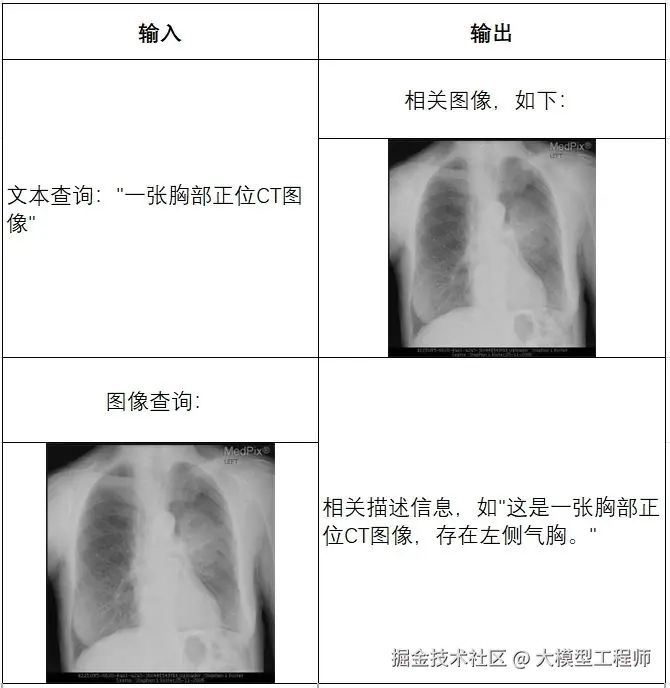 支持跨模态查询,例如文本查询匹配图像,或图像查询匹配文本。例如当输入为文本时,如 "一张胸部正位CT图像",则会输出最相关的胸部 CT 的图片;而当输入为胸部 CT 的照片时,则会输出相关描述文本,如 "这是一张胸部正位CT图像,存在左侧气胸"。