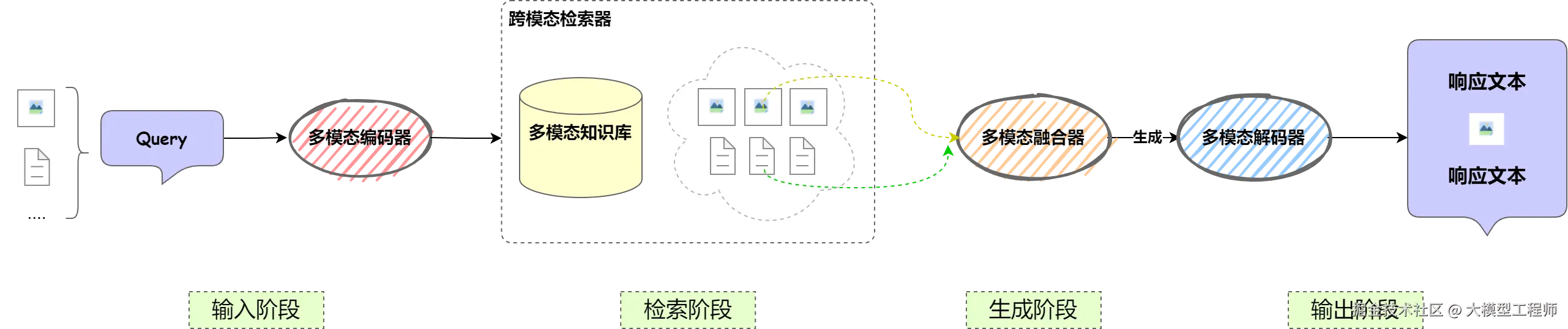 - 生成模块:基础 RAG 仅针对文本生成,现在需要扩展支持多模态输出,如文本结合图像、音频的生成能力。