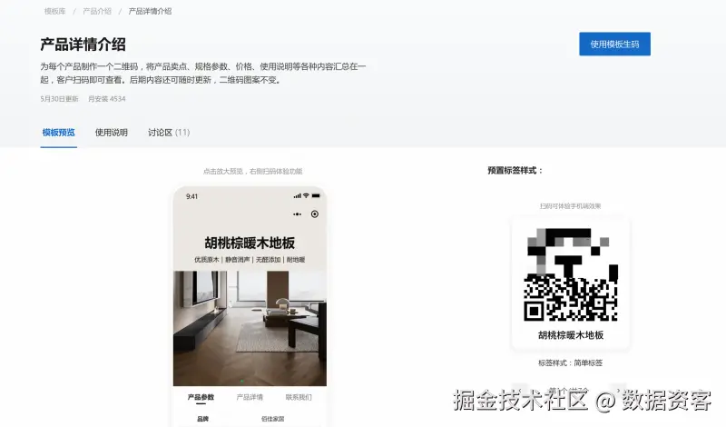 草料二维码提供了多种模板样式,适用于不同展示需求。如果希望内容更完整,推荐使用“产品详情介绍”模板,结构清晰、信息集中,适合贴在包装、展厅或样品上。