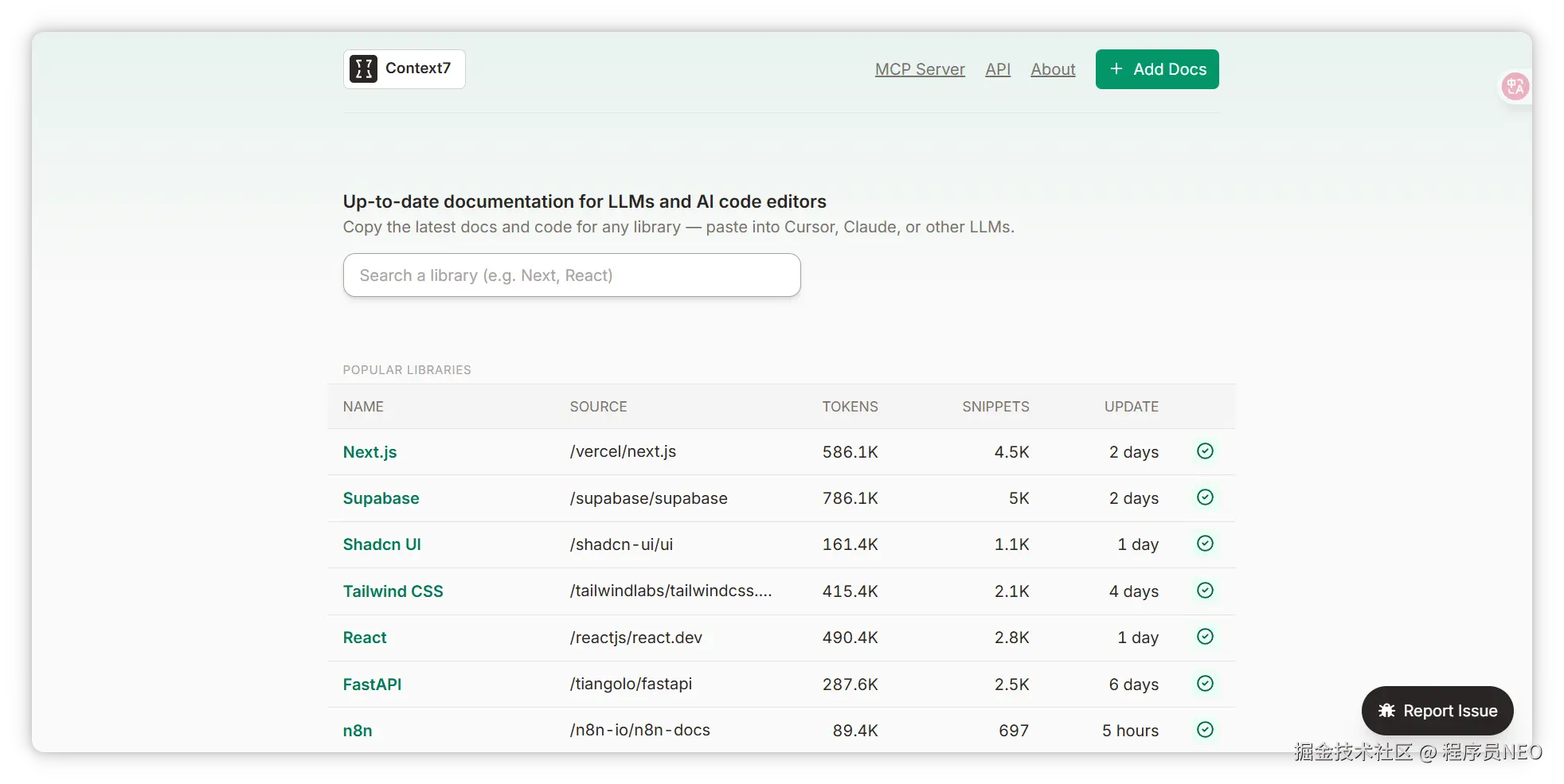 除了 MCP 集成,Context7 还提供了一个便捷的网站服务:context7.com