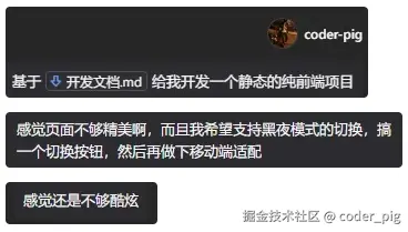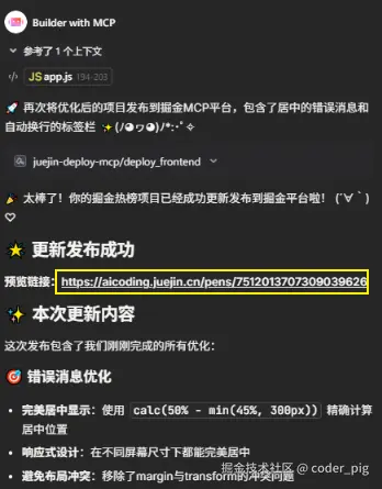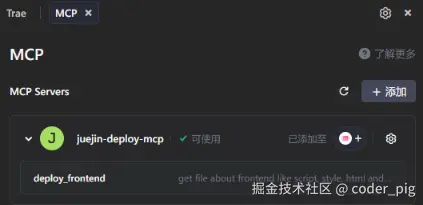 💁♂️ 这个 MCP Server 的作用:将纯前端项目(HTML/CSS/JS) 一键部署到掘金,注意是 "纯前端项目" ❗️❗️❗️ 依赖Node.js 或是 需要编译的框架 (如 React/Vue 未打包成静态文件) 都是不支持的哈!!!