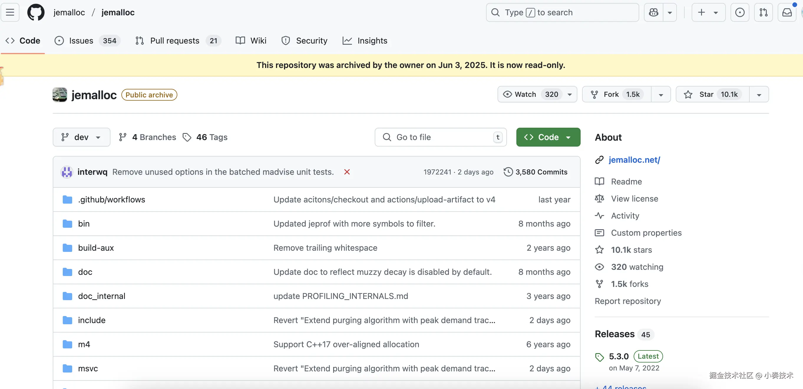 jemalloc 代码仓库的归档,标志着一个时代的结束。虽然它将不再有新的官方功能更新和活跃的维护,但这并不意味着它的价值就此消失。