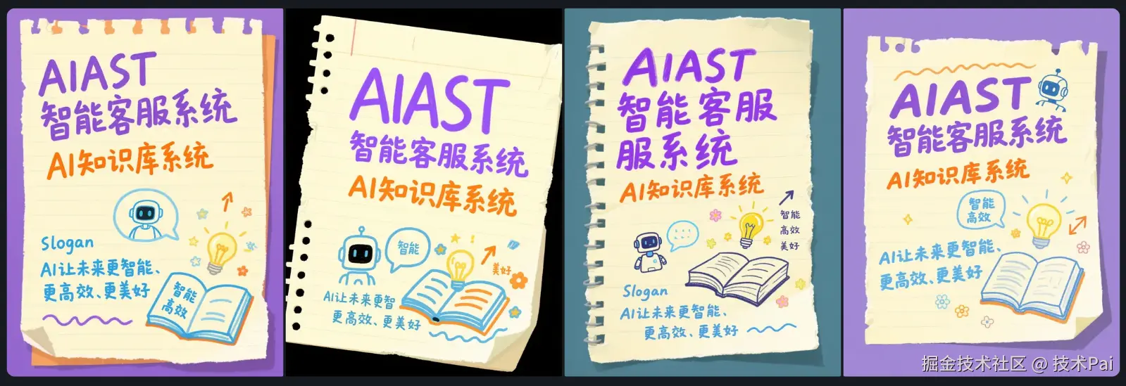 竖版手绘涂鸦风格图片设计,3:4比例。淡黄色横线笔记纸背景,具有清晰纸张纹理和自然横线,边缘有轻微手撕感。主标题 "AIAST智能客服系统" 采用科技紫色粗体标记笔手写风格,字号醒目,位于画面中上部。紧随其后的是副标题 "AI知识库系统" ,用活力橙色细线标记笔风格书写。画面底部是Slogan "AI让未来更智能、更高效、更美好" ,采用天空蓝色温柔手写体,Slogan下方可搭配一条手绘的柔和波浪线。点缀可爱的涂鸦元素:主标题旁有一个友善的手绘机器人头像和对话气泡;副标题旁有一本打开的书本涂鸦,书本上方有一个小小的发光灯泡图标;Slogan中的 "智能" "高效" "美好" 字眼旁分别点缀手绘小星星、向上箭头和小花朵图案。整体色彩明亮温暖,充满手绘的亲切感和对AI赋能美好未来的积极展望。