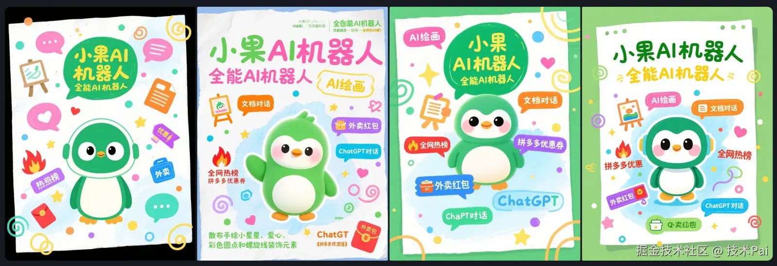 竖版可爱卡通手绘涂鸦风格图片设计,3:4比例。画面中央是一个Q版“小果AI机器人”小企鹅形象,果绿色为主调,大眼睛,造型圆润友好。背景为纯净的空白画纸,带有淡淡的浅天蓝色水彩笔触晕染效果,有轻微纸张颗粒感。机器人上方是主标题 "小果AI机器人" ,采用醒目的果绿色、圆润可爱的童趣手写体。紧随其下是副标题 "全能AI机器人" ,用柠檬黄色细线标记笔风格书写,字体活泼。众多功能点以“文字+图标”的小组合形式,如彩色气泡般围绕漂浮在机器人周围: "AI绘画" (粉色文字 + 手绘小画板与画笔图标), "文档对话" (橙色文字 + 文件与对话气泡图标), "全网热榜" (红色文字 + 火焰图标), "拼多多优惠券" (紫色文字 + Q版优惠券标签图标), "外卖红包" (亮蓝色文字 + Q版外卖盒图标), "ChatGPT对话" (薄荷绿文字 + 交叠对话气泡图标)。画面中散布大量手绘小星星、爱心、彩色圆点和螺旋线等装饰元素。整体色彩鲜艳明快,充满活力与趣味性,凸显AI机器人的全能与亲和力。