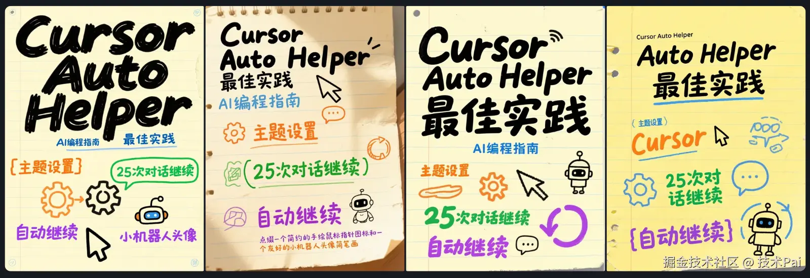手绘涂鸦风格。淡黄色笔记纸质背景,带有清晰纸张纹理、轻微边缘磨损和浅蓝色横线。主标题 "Cursor Auto Helper 最佳实践" 采用粗体黑色标记笔风格,超大字号,字体略有动感,位于画面中上部。副标题 "AI编程指南" 用蓝色细线标记笔书写,中等字号,位于主标题下方。核心要点分散布局,富有手写笔记感: "主题设置" 用橙色随性笔记体书写,旁边有手绘齿轮图标; "25次对话继续" 用绿色涂鸦体书写,旁边有手绘对话气泡图标; "自动继续" 用紫色创意涂鸦体书写,旁边有手绘循环箭头图标。点缀一个简约的手绘鼠标指针图标和一个友好的小机器人头像简笔画。整体色彩丰富协调,充满活力与科技感,同时保持强烈的手工质感和亲和力,营造专业而友好的学习氛围。