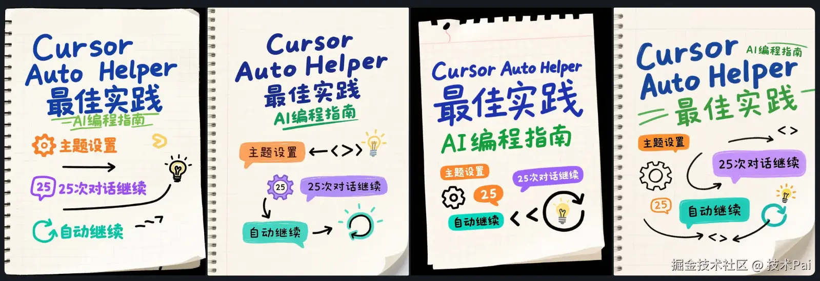 竖版手绘涂鸦风格图片设计,AI工具使用指南。背景为浅米白色方格纸,带有清晰的浅灰色方格线条和轻微纸张颗粒感,边缘有轻微自然卷边效果。主标题 "Cursor Auto Helper 最佳实践" 采用深蓝色粗体标记笔手写风格,字号超大,字体略带倾斜,醒目地位于画面上部。副标题 "AI编程指南" 采用中绿色细线标记笔手写风格,自然书写感,位于主标题下方。核心要点采用多彩手写笔记体,分散但有序布局:第一个要点 "主题设置" 为橙色手写体,旁边配有手绘小齿轮图标;第二个要点 "25次对话继续" 为紫色随性笔记体,旁边配有手绘对话气泡图标并在气泡内写上"25";第三个要点 "自动继续" 为青绿色创意涂鸦体,旁边配有手绘循环箭头图标。使用手绘黑色细线箭头连接或引导视觉流程。在空白处点缀少量与编程相关的简化涂鸦符号,如代码括号< >或小灯泡。整体色彩搭配清晰、活泼且具有科技感,模拟在方格笔记本上记录的实用技巧,手工质感强,视觉引导清晰,营造一种高效学习、轻松掌握AI工具的友好氛围。
