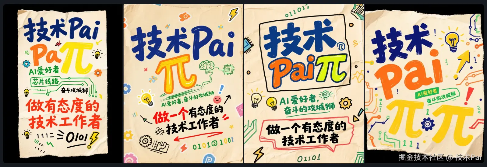 竖版手绘涂鸦风格社交媒体封面,3:4比例。米黄色牛皮纸质背景,具有清晰的纸张颗粒感和边缘轻微自然磨损效果,整体营造温暖复古且充满活力的科技探索氛围。主视觉文字 "技术Pai" 醒目地位于画面偏中上方:"技术"二字采用深蓝色粗体标记笔手写风格,稳重而有力量;"Pai"字采用橙色创意涂鸦体,字形活泼略带倾斜。一个手绘的明黄色荧光笔风格 "π" (Pi) 数学符号巧妙地与 "Pai" 字互动或在其附近突出显示。在主视觉下方,用绿色细线标记笔或随性笔记体书写文字 "AI爱好者,奋斗的攻城狮",字体略小,自然手写感,其中“AI爱好者”旁边可点缀小型手绘脑电波或芯片线路涂鸦。更下方或作为点睛之笔,用红色或有力的黑色中粗手写体书写文字 "做一个有态度的技术工作者",此行文字可略微加粗或用手绘波浪下划线/不规则对话框边框强调。画面中散布着多彩手绘涂鸦装饰元素,与文字内容呼应:如闪亮的小灯泡图标(创意),简化的手绘小齿轮(技术运作),指向性的手绘箭头,抽象的电路板线条,二进制代码0101的散点,代表奋斗的向上小箭头或小闪电符号,以及代表态度的感叹号涂鸦。整体色彩搭配采用深蓝色、橙色、明黄色、绿色、红色/黑色,鲜明活泼,对比清晰,充满科技创意与年轻奋斗者的热情。所有元素均呈现真实手工涂鸦质感和纸张质感,布局随性自然但有视觉重心,充满亲和力、探索趣味和鲜明的个人