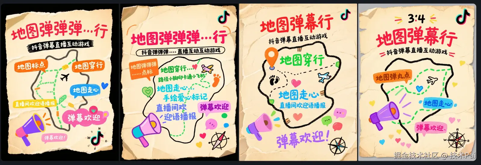 竖版手绘涂鸦风格社交媒体封面,3:4比例。背景为米黄色牛皮纸,具有清晰的复古纸张纹理及轻微的边缘磨损和褶皱效果。画面中央是一个可爱风格的简化手绘地图轮廓。主标题 "地图弹幕行" 采用醒目的红色粗体标记笔手写艺术字,位于地图上方。副标题 "抖音弹幕直播互动游戏" 使用黑色细线标记笔手写体,在主标题下方。核心功能点以多彩手写笔记体呈现并搭配图标: "地图标点" (活力橙色文字) 旁有多个彩色手绘定位图钉图标散落在地图上; "地图穿行" (草绿色文字) 体现在地图上画有虚线路径、小脚印和卡通小飞机图标; "地图走心" (天蓝色文字) 则在地图上几个城市位置点缀了手绘爱心标记。直播互动特性: "直播间欢迎语播报" (梦幻紫色文字) 旁边有一个手绘扩音器图标; "弹幕欢迎" (甜心粉色文字) 附近有许多五彩斑斓的小对话气泡向上漂浮,模拟弹幕。画面一角有一个小巧的手绘抖音logo图标和指南针图案。整体风格活泼热闹,充满探索旅行的乐趣和直播间的互动氛围。