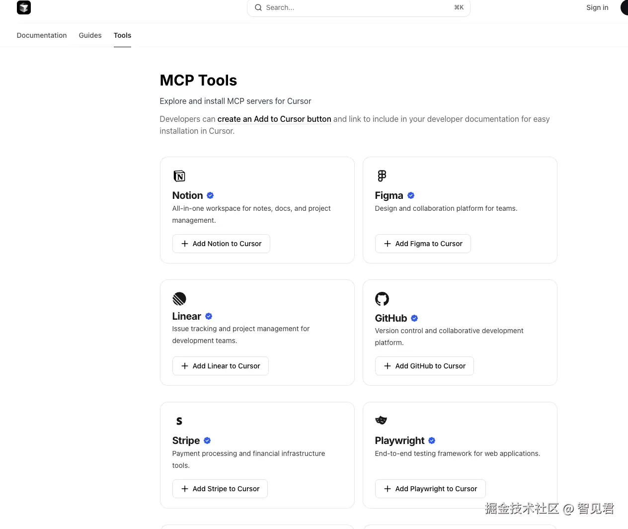 现在,您可以一键在 Cursor 中设置 MCP 服务器,官方提供了一份简短的官方 MCP 服务器列表,您可以在 docs.cursor.com/tools 添加到 Cursor