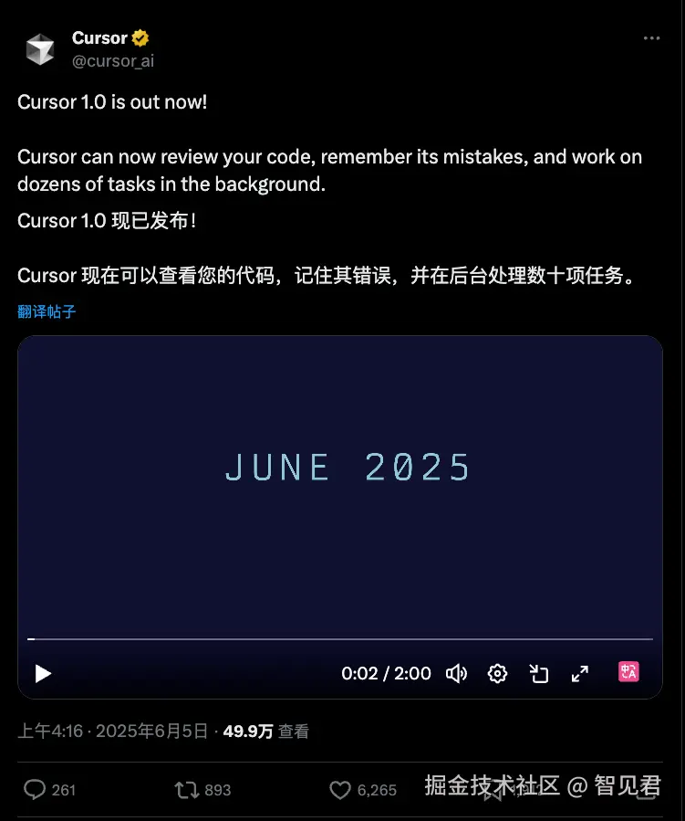 大家好!AI 编程助手 Cursor 正式发布了 1.0 版本。这是一个里程碑式的更新。之前我们还在讨论 0.51 版本的灰度发布,没想到官方憋了个大招,直接跳到了 1.0 正式版。这次更新带来了很多重磅功能。让我们一起看看 Cursor 1.0 有哪些令人兴奋的新特性。