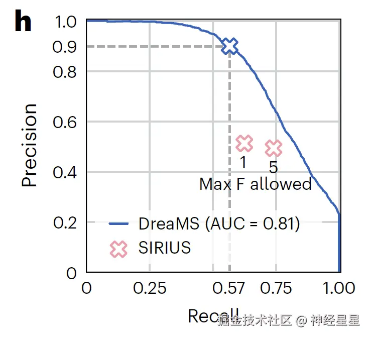 在最具挑战性的含氟分子检测任务中, 如下图所示,DreaMS 通过概率预测模型实现 0.91 的精确度与 0.57 的召回率,远超依赖碎裂规则组合搜索、精确度仅 0.51 的 SIRIUS 算法, 尤其在结构新颖的分子检测中展现出强泛化能力,为氟化物相关药物研发与环境监测提供了关键工具。