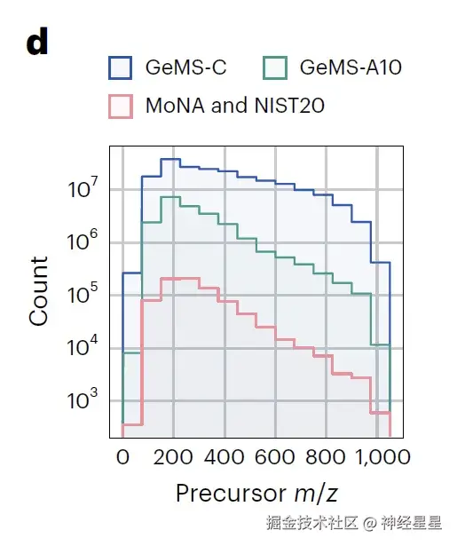 为解决大规模数据中的冗余问题,研究团队采用局部敏感哈希(LSH)算法对相似光谱进行高效聚类,通过限制聚类内光谱数量生成九种变体,在维持数据代表性的同时优化计算效率。最终以紧凑型 HDF5 二进制格式存储的 GeMS 数据集,将原始光谱转化为固定维度的数值张量, 打破了传统光谱库的规模瓶颈——如下图所示,其数据量较现有库扩大数个数量级,且结构标准化程度高,为深度学习模型提供了前所未有的训练素材。这些数据特点使 GeMS 成为首个适合无监督/自监督学习的超大规模质谱数据集,不仅为 DreaMS 模型的预训练奠定基础,更通过质量分层和格式优化,为后续光谱相似性分析、分子结构表征等任务提供了兼具精度与广度的数据支撑,推动代谢组学研究从依赖有限参考库的传统模式,向基于海量原始光谱的智能解析范式转变。
