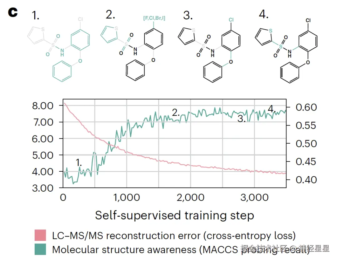 该研究运用线性探测技术,对训练阶段所获取表征的变化进行了评估。 首先,在训练过程中,基于母离子嵌入向量的逻辑回归模型可逐渐预测 MACCS 键指纹,表明模型在自监督中习得分子碎片信息;其次,注意力头分析显示,模型优先关注表征分子结构的特征峰而非噪声;最后,表征空间聚类结果表明,即使不同电离条件下的光谱,也能按分子结构线性分布,验证了其对结构特征的捕捉能力。