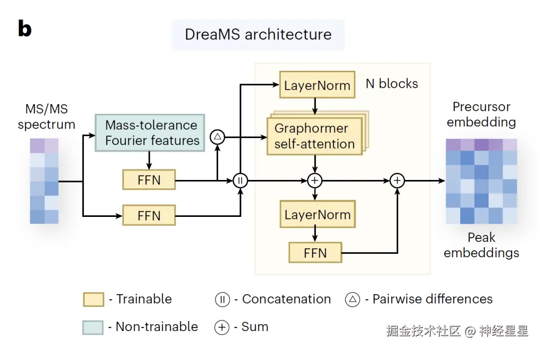 在模型架构方面,如下图所示,DreaMS 基于 7 层 Transformer 编码器,配备 8 头自注意力机制,可生成 1,024 维表征向量。 针对高分辨率质荷比数据,模型采用傅里叶特征(Fourier features)预处理技术,将连续质量值分解为正弦/余弦频率分量,捕捉整数与浮点部分的细节,并通过前馈网络进一步关联元素组成预测;强度值经浅层网络处理后与傅里叶特征拼接,作为 Transformer 输入。此外,DreaMS 显式引入所有峰对的傅里叶特征差异至自注意力头(借鉴 Graphormer 架构), 直接建模中性损失关系,避免额外标记或复杂计算。