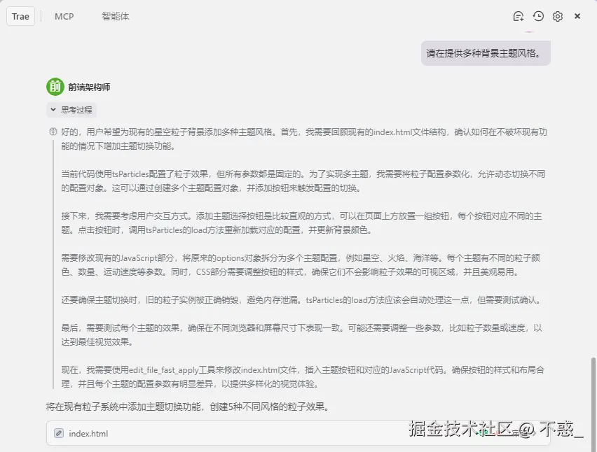 今天,我将带你一步步走进如何使用 Trae IDE 来为网站生成一个炫酷的星空粒子背景,并让它完美融入你的网页设计中。