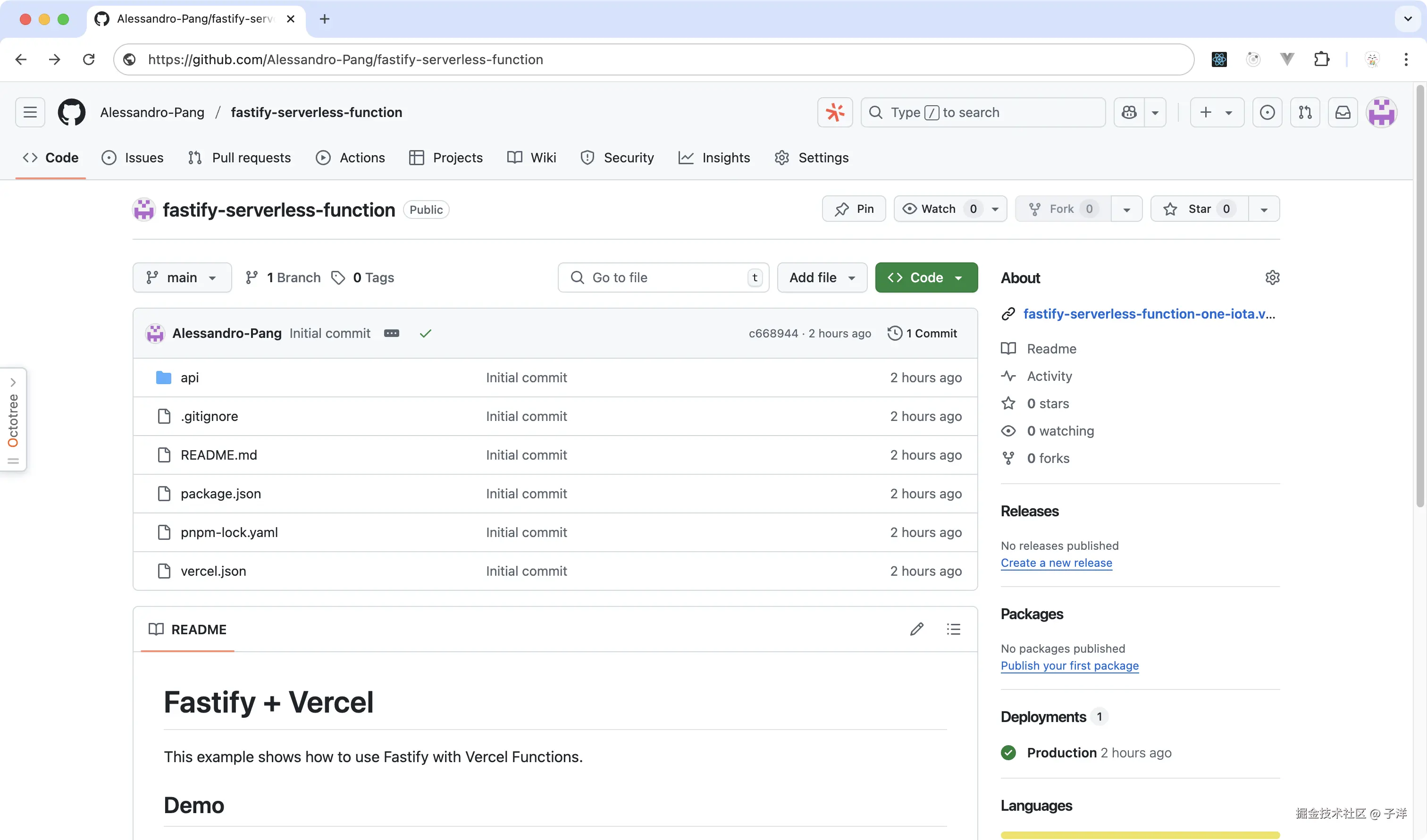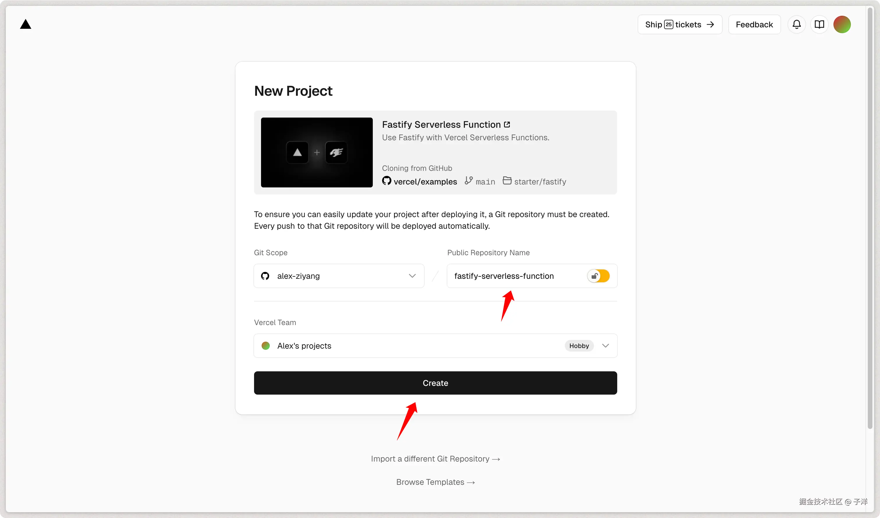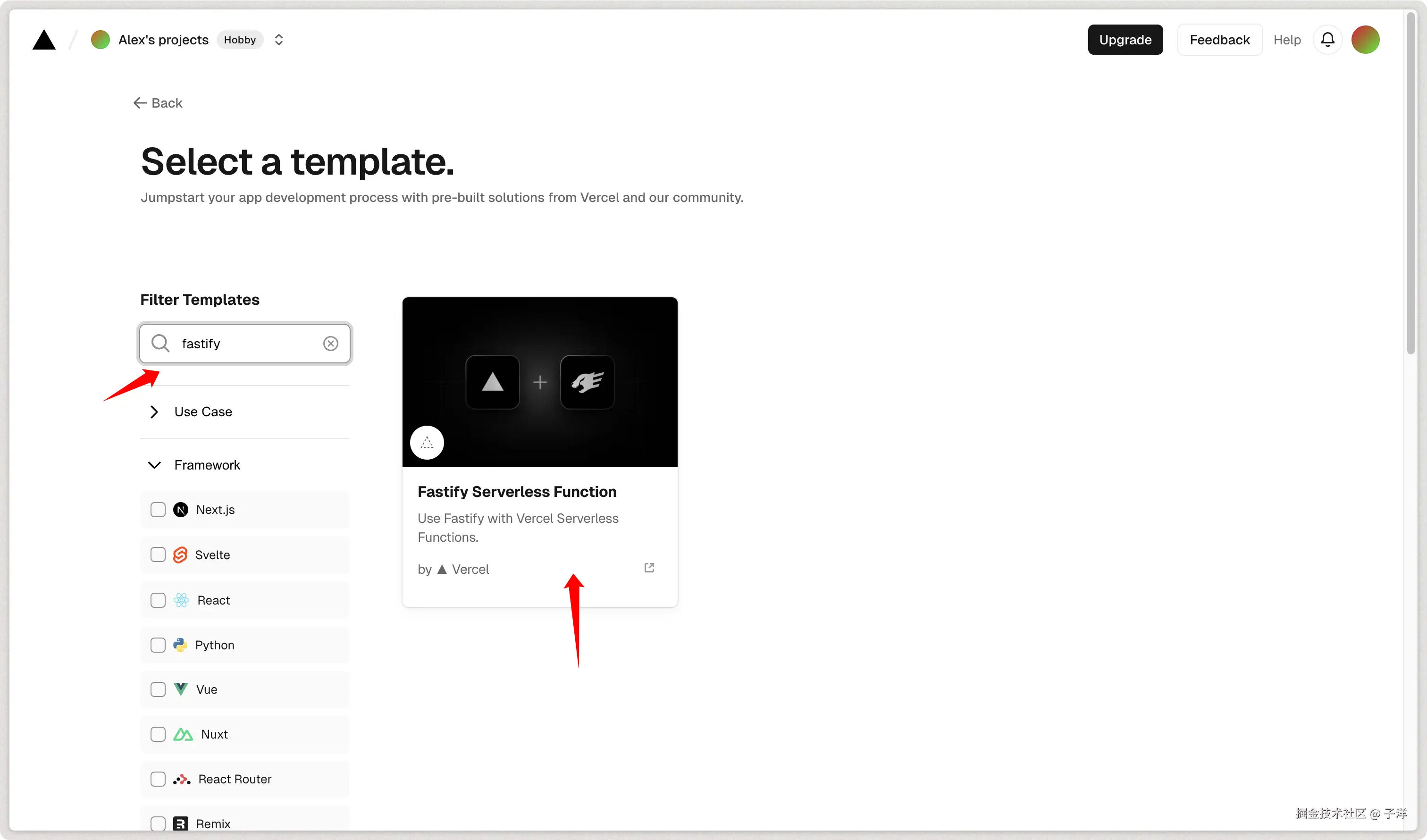 因为我对 Vercel 的配置文件不是特别熟悉,所以为了简化工作流程,直接从 Vercel 官网提供的模板中选取一个 Fastify 模板项目,这样可以大大减少初始化工作量。