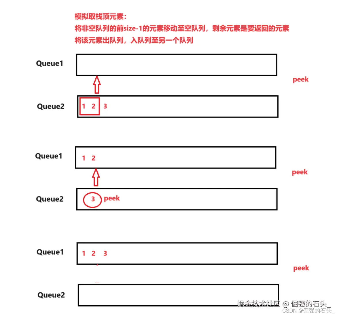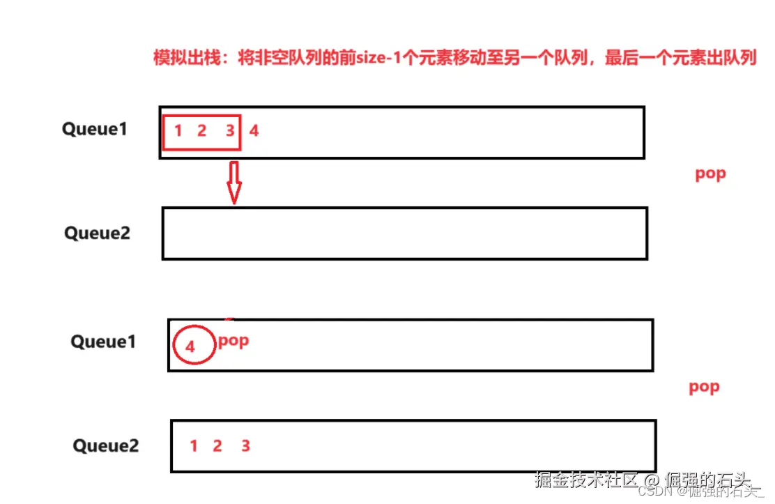 - 将非空队列中的元素(除了最后一个)逐个出队并入队到另一个队列中,直到只剩下最后一个元素。此时,该元素就是栈顶元素,我们将其出队并返回。