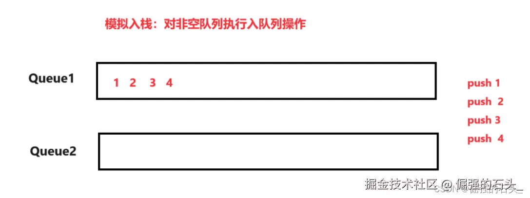 - 初始化:初始化两个空队列,在任意时刻,我们只会使用其中一个队列来进行入栈和出栈操作,而另一个队列则保持为空。