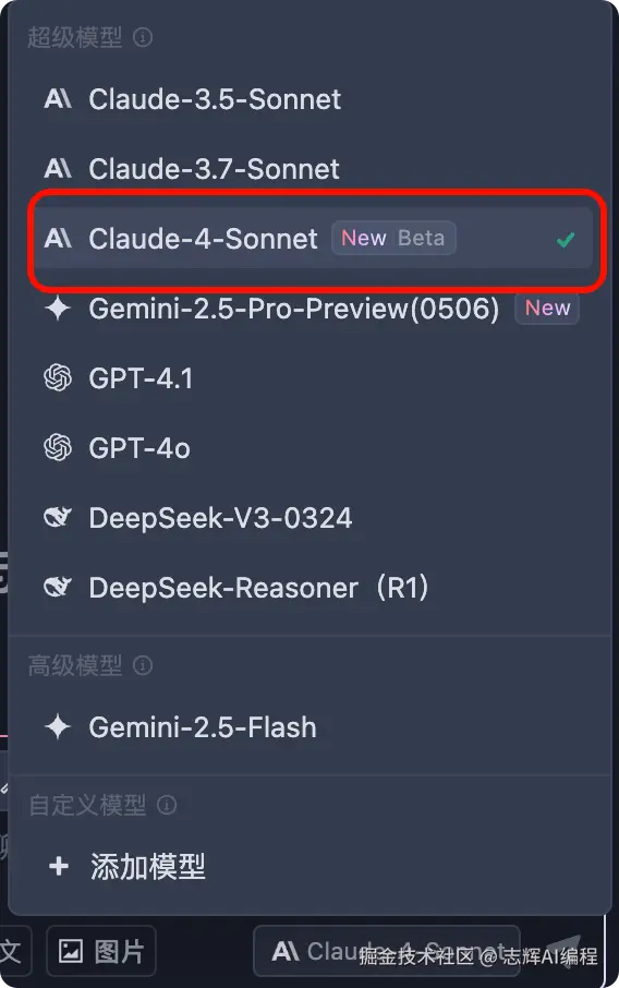 一如既往,选择 Claude 4 模型,不过这里就没有 Opus 4 可以选择了,后续应该会有支持的。